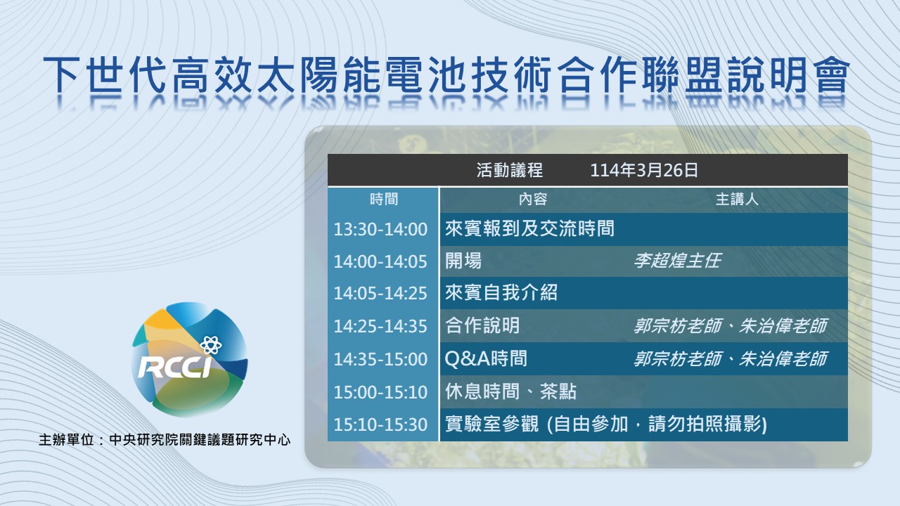 我們將於114年3月26日下午2:00,在中央研究院南部院區的關鍵中心大樓一樓演講廳(台南市歸仁區歸仁十三路一段100號)舉行「下世代高效太陽能電池技術合作聯盟」說明會。誠摯邀請貴公司加入「疊層式太陽能電池研發聯盟」,共同投資未來能源技術,提升台灣綠色產業價值,有意願參加說明會者,請上網報名。網址為:https://forms.gle/MKzXzDMHXQ9PYFgZ9